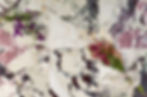 Fragmented, brecciated pattern with irregular patches of dark red, brown, and cream
